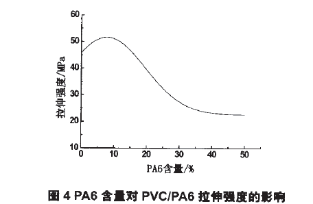圖4是PVC/PA6共混物的拉伸強度曲線。從圖4可以看出,其變化趨勢同沖擊強度的變化趨勢基本一致,都是在PA6含量為10% 時達到較大值,此時共混物的拉伸強度為60MPa,較純PVC提高了30%。當PA6含量超過10% ,共混物的拉伸強度逐漸降低;當PA6含量超過35% 以后,拉伸強度逐漸趨于平穩。從圖3和圖4可以看出,當PVC與PA6的配比為90/10時,共混物的缺IzI沖擊強度和拉伸強度都較純PVC有明顯改善。