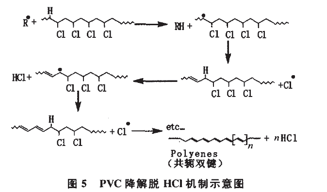 PVC樹脂降解脫HC1是型材變色的主要內部因素,其降解機制示意圖見圖5。