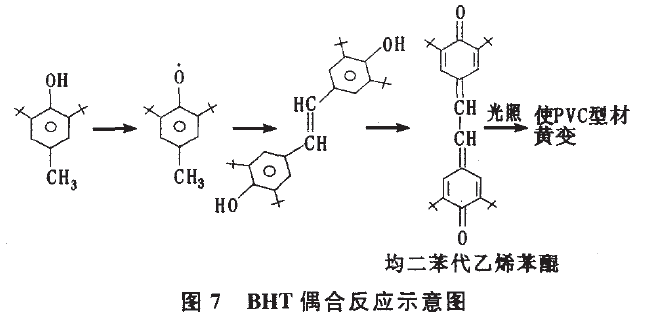 目前。PVC型材生產廠家使用的穩定劑以復合穩定劑為主,除了對PVC降解起穩定作用的主體化合物。還包含潤滑體系、抗氧體系等助穩定體系。其中的抗氧體系可能包括酚類穩定劑和亞磷酸酯類助穩定劑。這些化合物可能含有易變色的有機雜質,另外它們自身有可能在光、氧、水的作用下發生變色反應。有資料報道指出,某些亞磷酸酯類產品可能含有顏色污染性成分。常用的亞磷酸酯類產品有亞磷酸酯三苯酯(TPP)和亞磷酸一苯二異辛醇(PDLOP),其中TPP由苯酚和三氧化磷反應制得。苯酚是一種化學性質不穩定的物質,它在光照下會發生互變異構反應,呈紅褐色。如果TPP生產過程控制不嚴,會造成產品羥基值過大,即殘留較多的苯酚單體,這樣的產品就可能導致型材在室外貯存或應用時發生變色現象。即使TPP無殘留苯酚單體,因其水解穩定性差,在潮濕、光照和受熱條件下會水解生成苯酚單體,也使型材變色。某些低空間位阻效應的酚類抗氧劑(如BHT),可能在紫外線照射、一定的濕度和氧的條件下發生偶合反應(如圖7所示)。